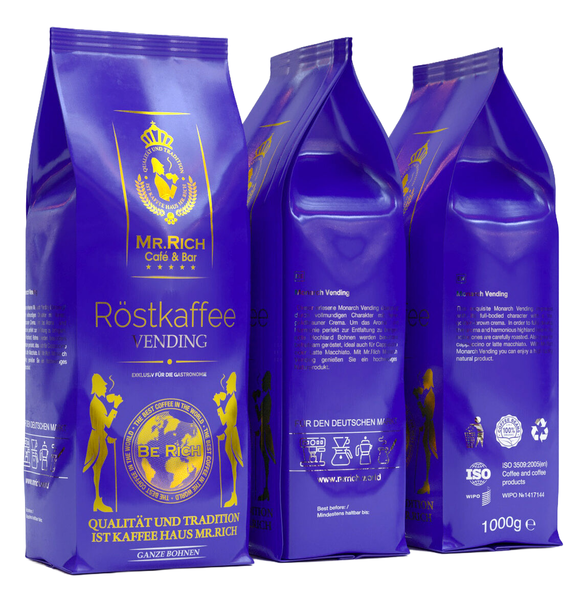 Кофе в зернах Mr.Rich "Monarch" - премиум бленд высокогорной Арабики и Робусты из Южной и Латинской Америки, Африки и Азии. Кофе обладает крепостью, насыщенным вкусом, ярковыраженным ароматом, отличной плотностью и хорошей кремой.