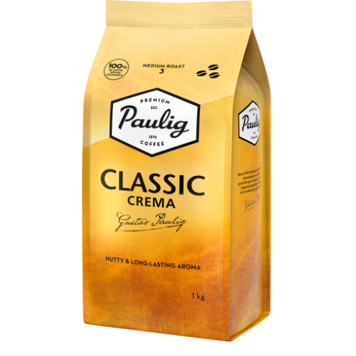 Paulig Classic Crema – бленд отборных зёрен арабика из Южной Америки с небольшим добавлением робусты из Азии. Ореховое послевкусие, насыщенный аромат и бархатистая пенка крема делают этот бленд идеальным для приготовления чёрного кофе (американо или эспрессо) в кофемашине. По сравнению с Paulig Classic, у зёрен Classic Crema более насыщенный и сильный вкус, а также менее выраженная кислотность.