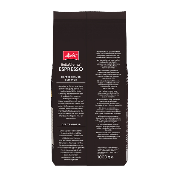 MELITTA Bella Crema Espresso — это крепкий, изысканный и ароматный бленд лучших сортов 100% арабики. Классический насыщенный напиток с нежными кремовыми и яркими пряными нотками и густой пенкой покорил сердца кофеманов. Бленд отлично сочетается с корицей, ванилью и шоколадом. Подходит для всех типов автоматических кофемашин.
