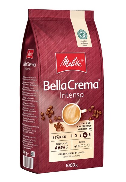 Почувствуйте глубокое богатство BellaCrema Crema Intenso от Melitta. Эта упаковка кофейных зерен весом 1 кг предлагает интенсивный, полный вкус, дополненный характерным ореховым ароматом. Специально изготовленн из 100% зерен арабики, он имеет средне - темную обжарку и легкую кислинку.